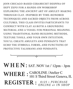 Join Chicago-based ceramicist Despina of Depy Zepo for a hands-on workshop exploring the ancient art of amulet-making through clay. Inspired by time-honored techniques and sacred objects from across cultures, this class invites participants to connect with clay as both a grounding material and a vessel for personal meaning. Using traditional hand-building methods, texture tools, and your own intuition, you'll create amulets and pendants that echo the symbols, forms, and functions of protective talismans and pendants.
