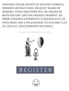 Whether you're drawn to ancient symbols, modern abstractions, or quiet marks of memory, your creations will be shaped by both history and the present moment. No prior ceramics experience is needed—just an open mind and a willingness to explore clay as a ritual and expressive material.